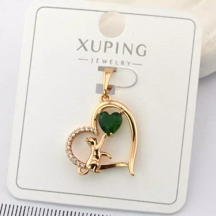 Кулон Xuping серце з котиком зелений камінь з медичного золота позолота 18К (01432)